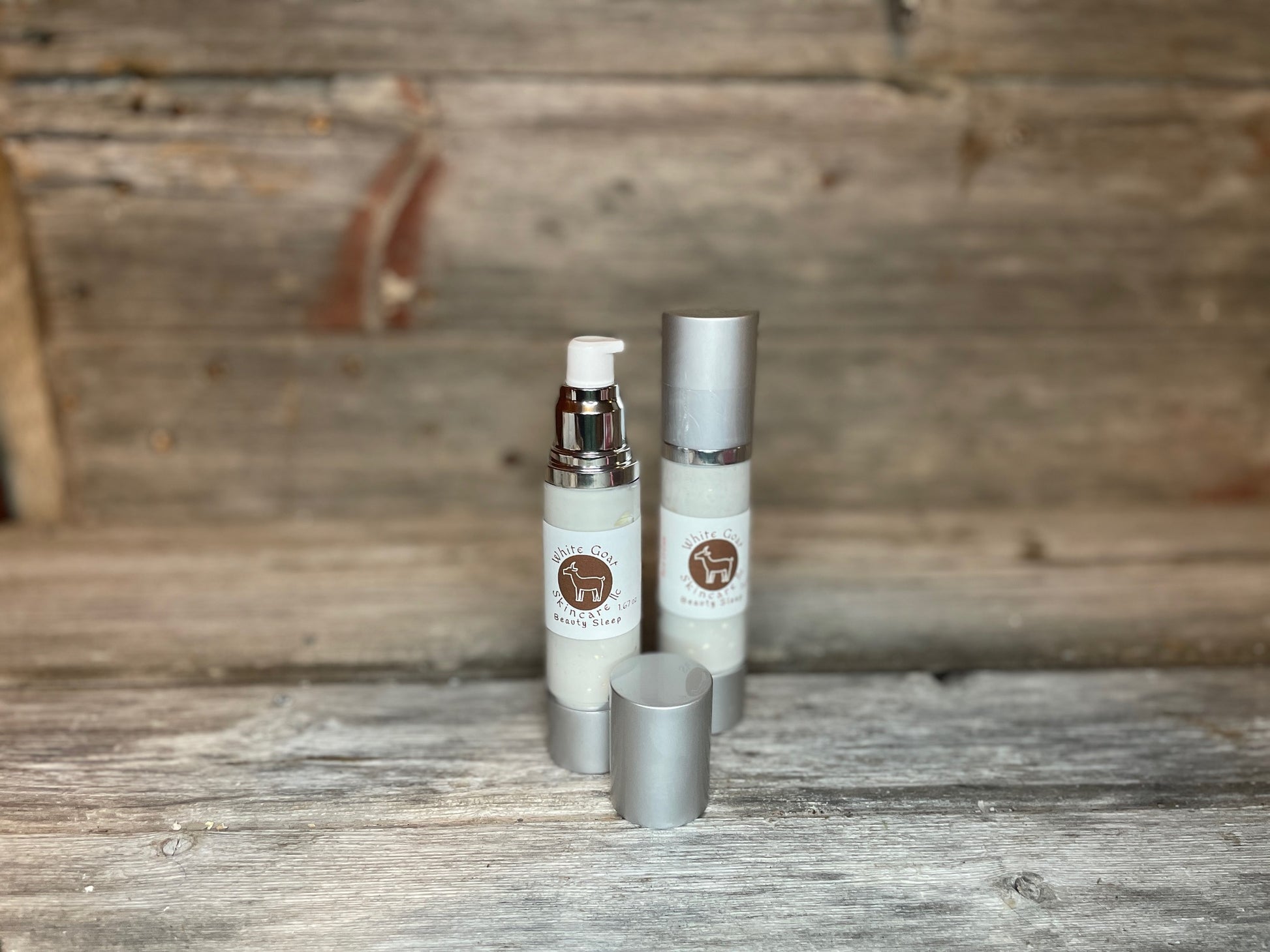 Beauty Sleep night time natural organic goat milk face lotion is made with natural moisturizing ingredients. Available in 0.50 oz. or 1.67 oz. airless bottle. It is a thicker night time moisturizer for face, neck and chest. Perfect if you prefer a heavier face lotion. Made with organic oils and organic essential oils that are traditionally thought to rejuvenate skin. The essential oils are known to aid in sleep, great for a restful night.