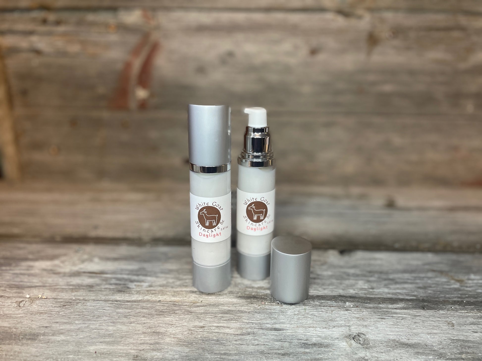 Daylight, a lightweight, day time organic goat milk face lotion for face, neck and chest. Available in 0.5 oz. or 1.67 oz. airless bottles to keep contaminants out. Made with light weight organic and non-comedogenic oils (does not block pores) known for moisturizing, rejuvenating and improving skin health. Essential oils provide a fresh citrus, woodsy uplifting scent that are known to also help with wrinkles and improve skin. Great for daytime.